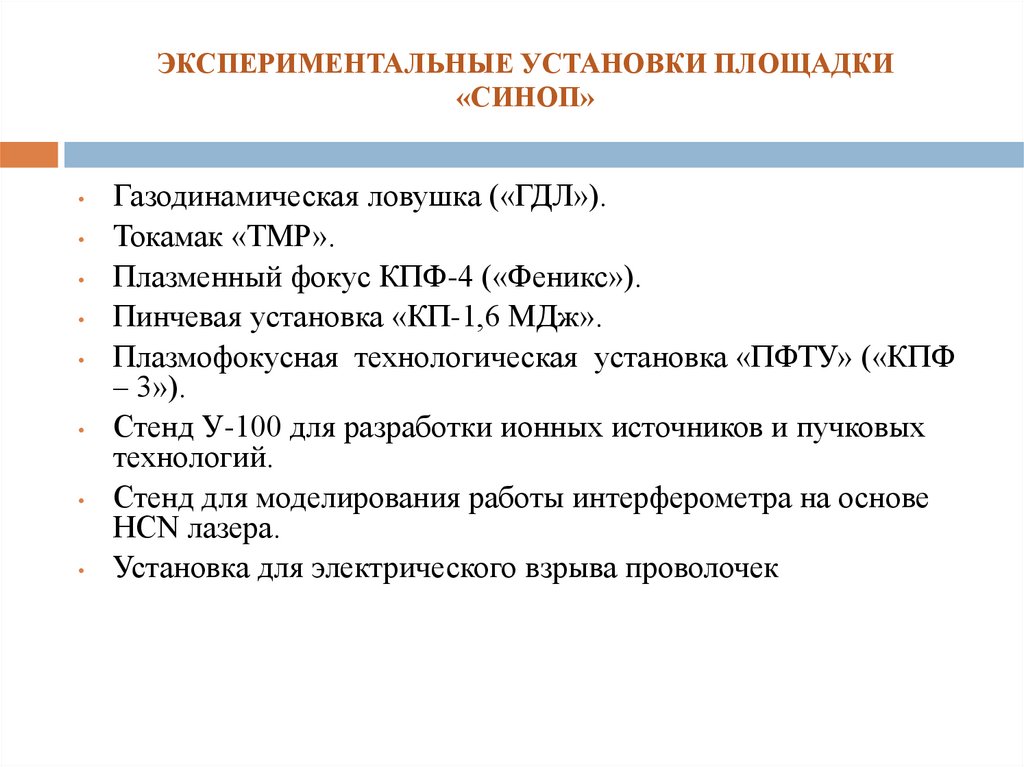 ЭКСПЕРИМЕНТАЛЬНЫЕ УСТАНОВКИ ПЛОЩАДКИ«СИНОП»