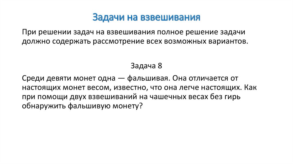 Задачи на взвешиванияПри решении задач на взвешивания полное решение задачи