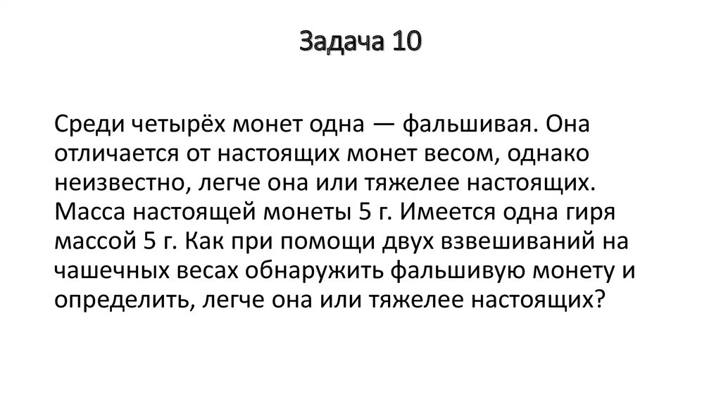 Задача 10Среди четырёх монет одна — фальшивая. Она