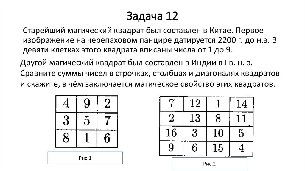 Задача 12Старейший магический квадрат был составлен в Китае. Первое