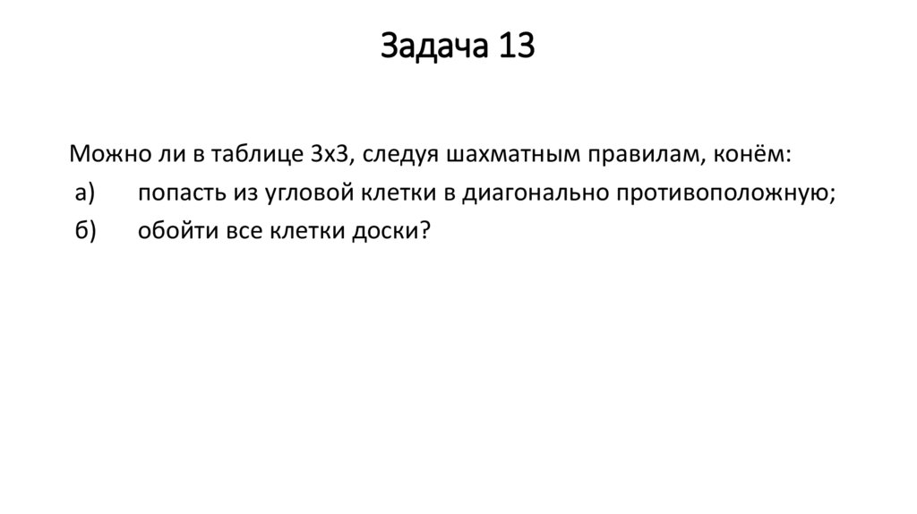 Задача 13Можно ли в таблице 3x3, следуя шахматным правилам, конём: