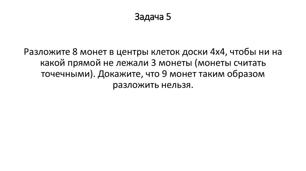 Задача 5Разложите 8 монет в центры клеток доски 4x4, чтобы ни на