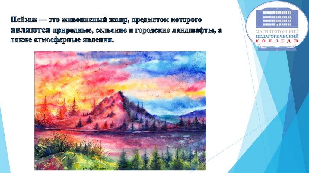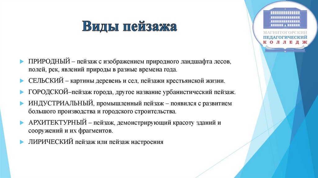 ПРИРОДНЫЙ – пейзаж с изображением природного ландшафта лесов,полей, рек, явлений природы в разные времена года.