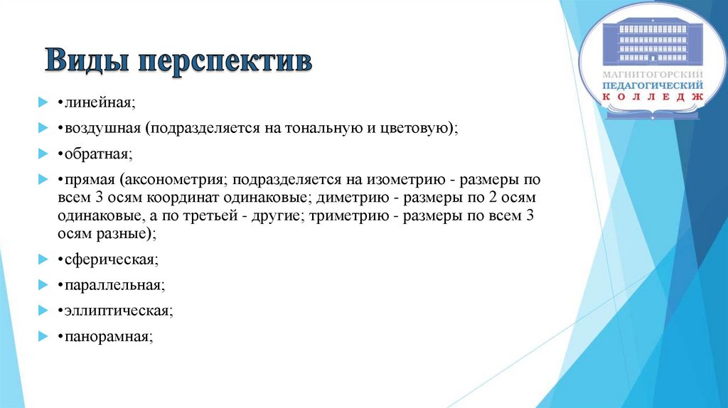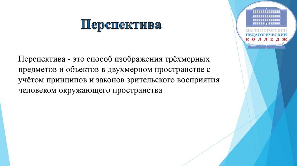 Перспектива - это способ изображения трёхмерныхпредметов и объектов в двухмерном пространстве с