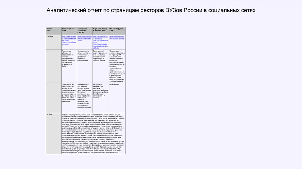 Аналитический отчет по страницам ректоров ВУЗов России в социальных сетяхРектор