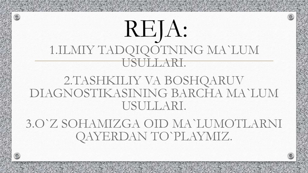 REJA:1.ILMIY TADQIQOTNING MA`LUM