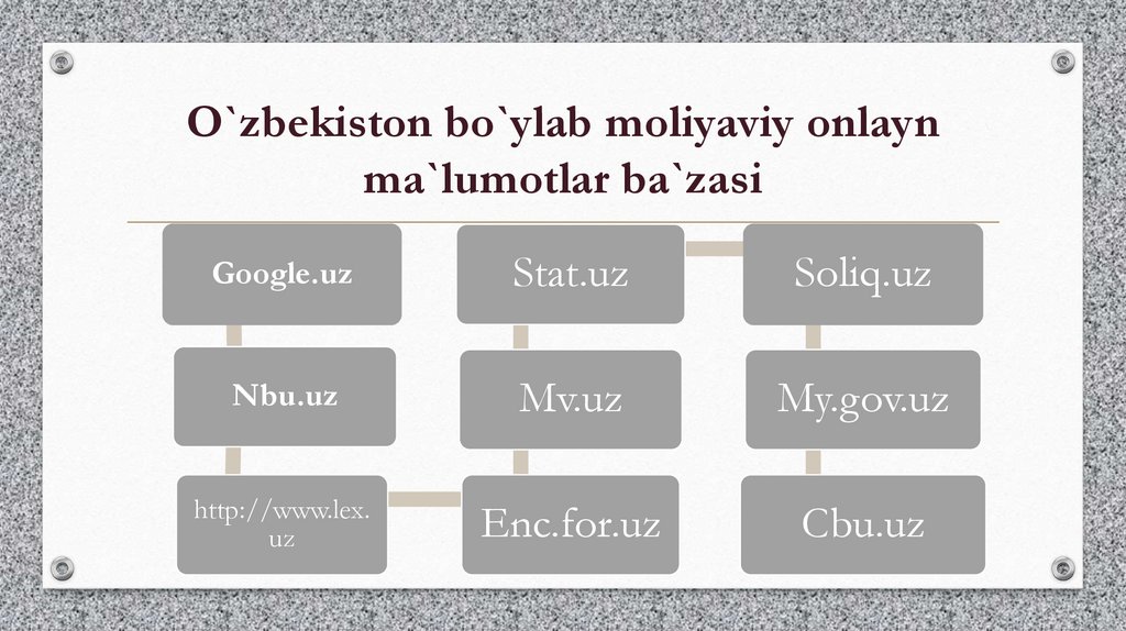 O`zbekiston bo`ylab moliyaviy onlaynma`lumotlar ba`zasi