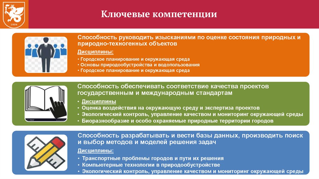 Ключевые компетенцииСпособность руководить изысканиями по оценке состояния природных и