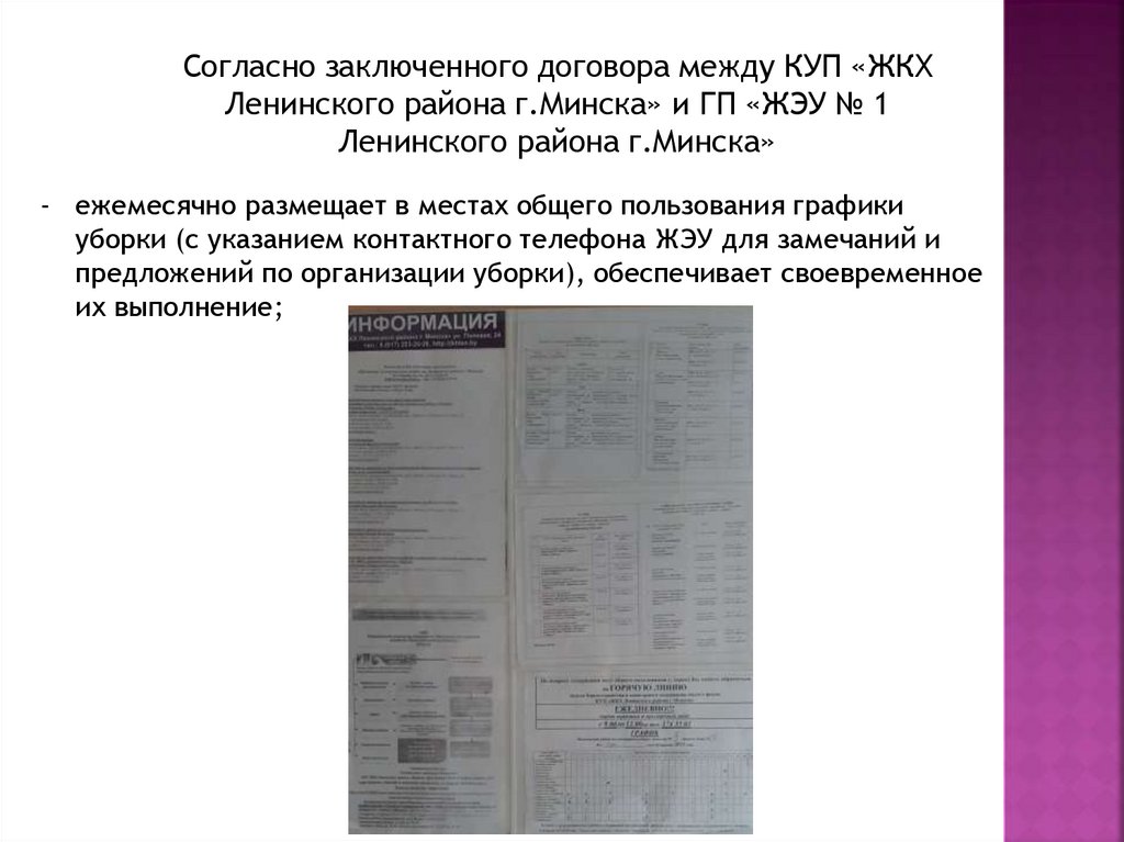 Согласно заключенного договора между КУП «ЖКХЛенинского района г.Минска» и ГП «ЖЭУ № 1