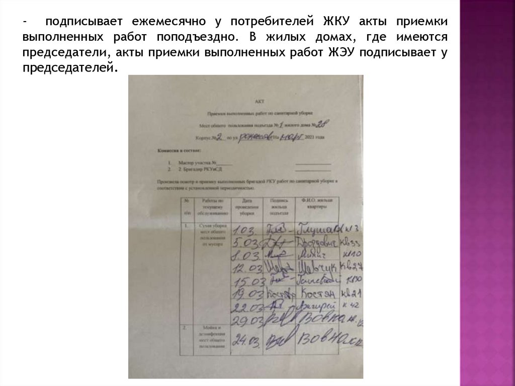 - подписывает ежемесячно у потребителей ЖКУ акты приемкивыполненных работ поподъездно. В жилых домах, где имеются