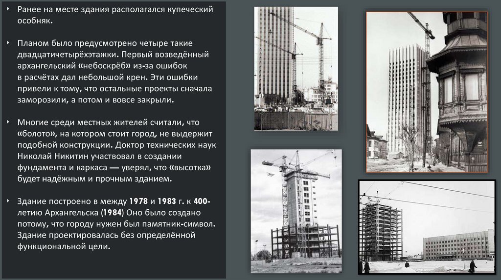 ‣ Здание построено в между 1978 и 1983 г. к 400летию Архангельска (1984) Оно было создано
