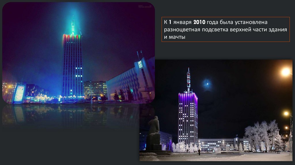 К 1 января 2010 года была установленаразноцветная подсветка верхней части здания