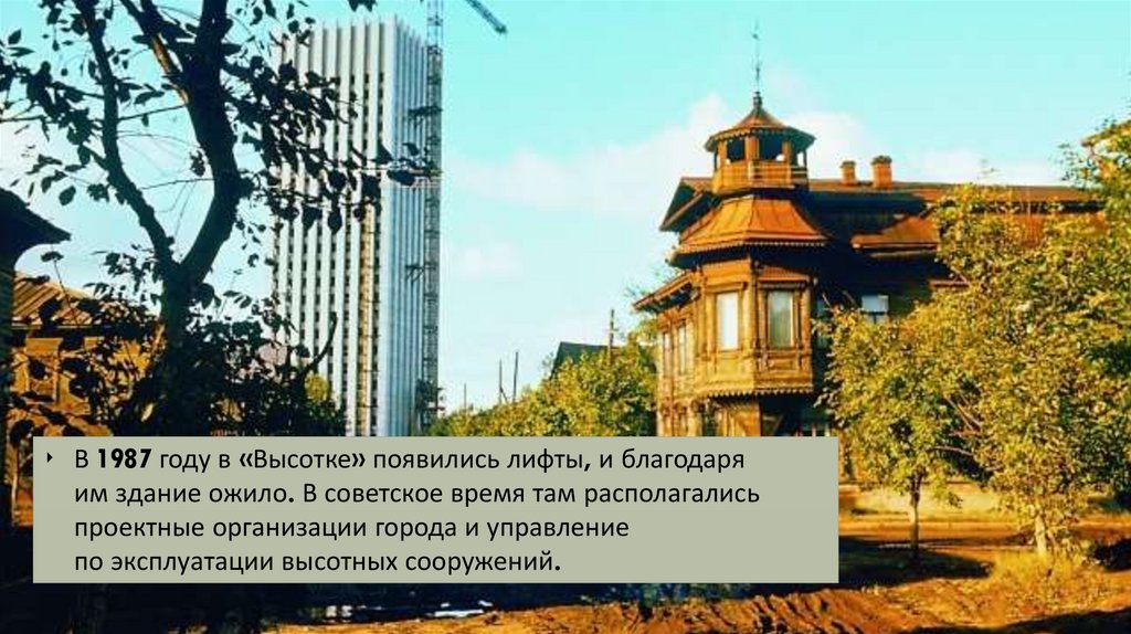 ‣ В 1987 году в «Высотке» появились лифты, и благодаряим здание ожило. В советское время там располагались