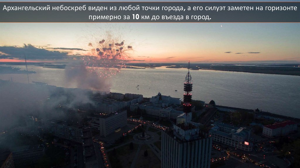 Архангельский небоскреб виден из любой точки города, а его силуэт заметен на горизонтепримерно за 10 км до въезда в город.