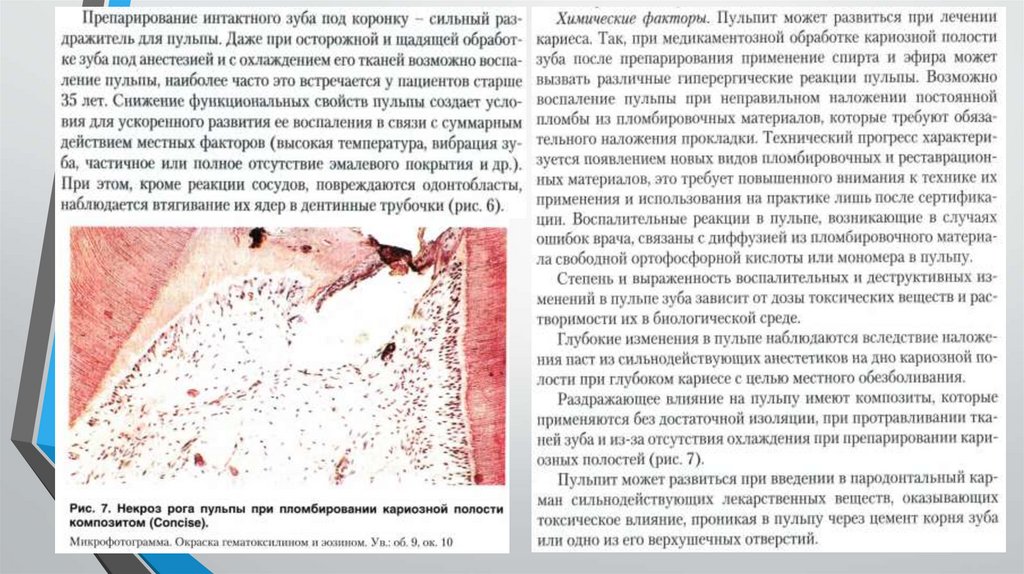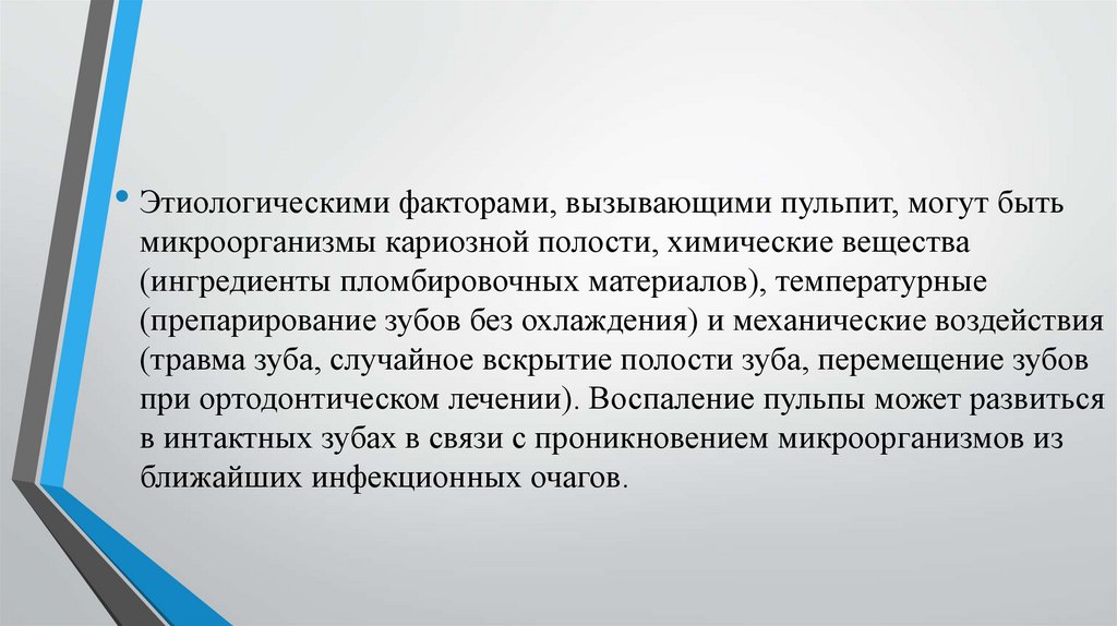 • Этиологическими факторами, вызывающими пульпит, могут бытьмикроорганизмы кариозной полости, химические вещества
