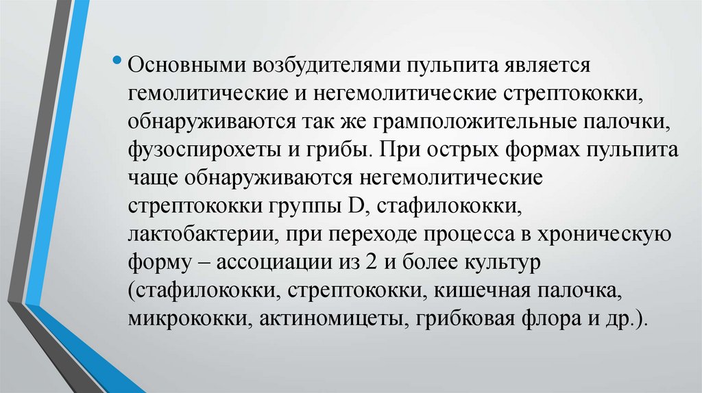 • Основными возбудителями пульпита являетсягемолитические и негемолитические стрептококки,