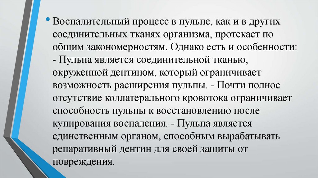 • Воспалительный процесс в пульпе, как и в другихсоединительных тканях организма, протекает по