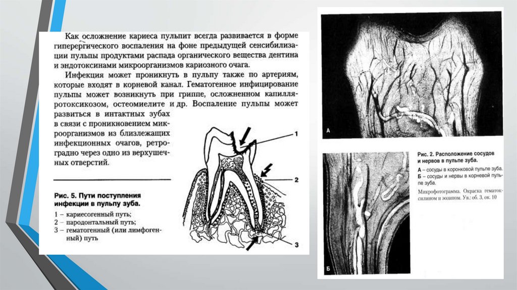ЭТИОЛОГИЯ И ПАТОГЕНЕЗ• Воспалительный процесс в пульпе зуба является
