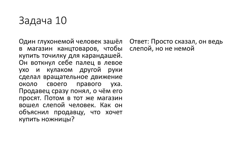 Задача 10Один глухонемой человек зашёл Ответ: Просто сказал, он ведь