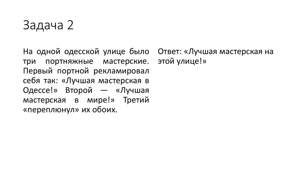 Задача 2На одной одесской улице было Ответ: «Лучшая мастерская на