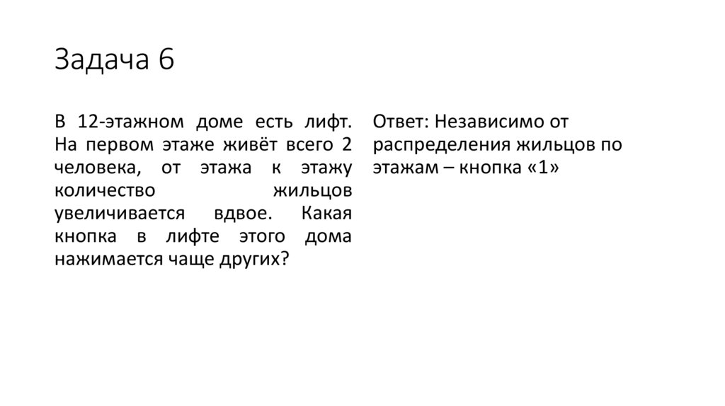 Задача 6В 12-этажном доме есть лифт. Ответ: Независимо от
