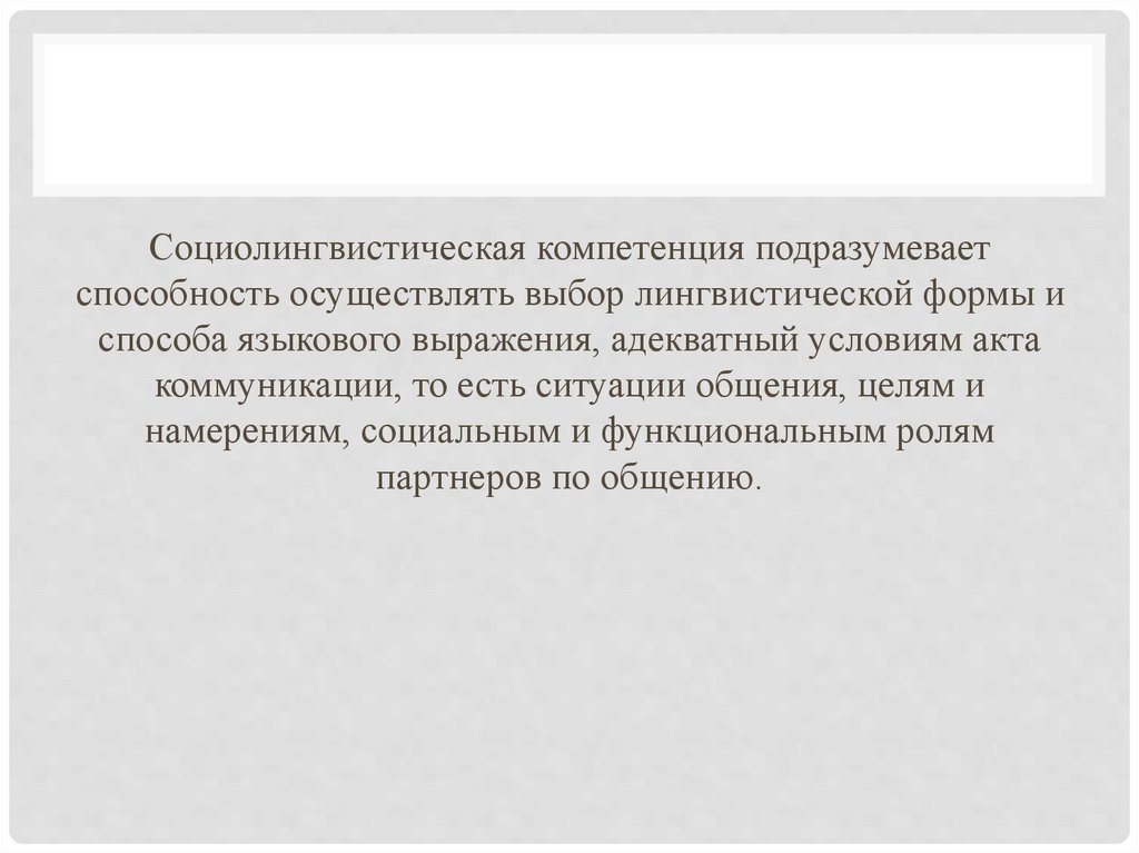 Социолингвистическая компетенция подразумеваетспособность осуществлять выбор лингвистической формы и
