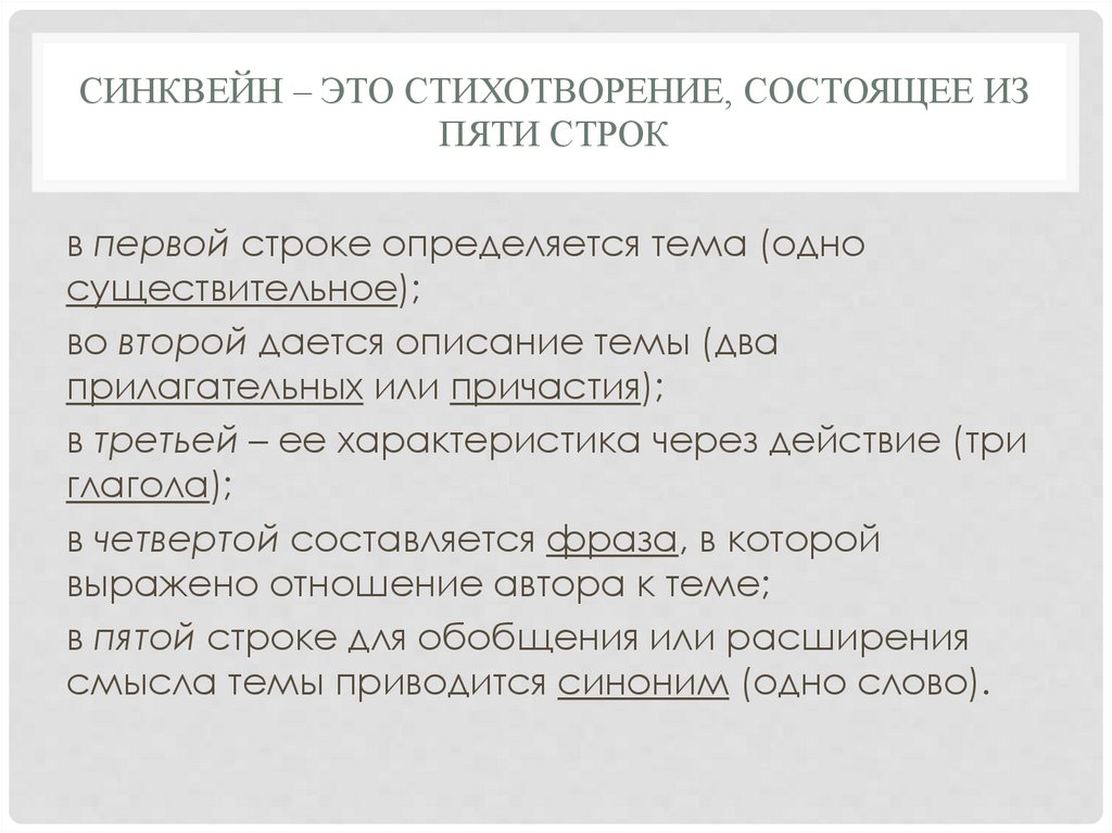 СИНКВЕЙН – ЭТО СТИХОТВОРЕНИЕ, СОСТОЯЩЕЕ ИЗПЯТИ СТРОК