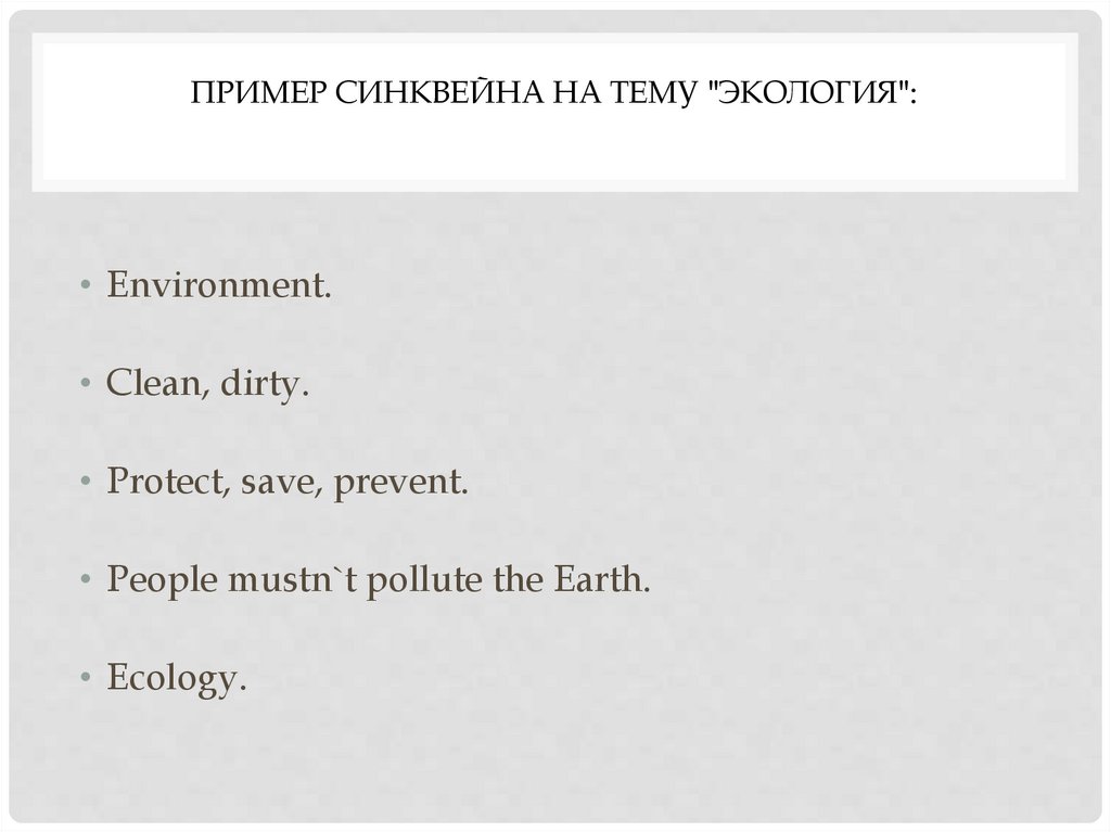 ПРИМЕР СИНКВЕЙНА НА ТЕМУ "ЭКОЛОГИЯ":• Environment.