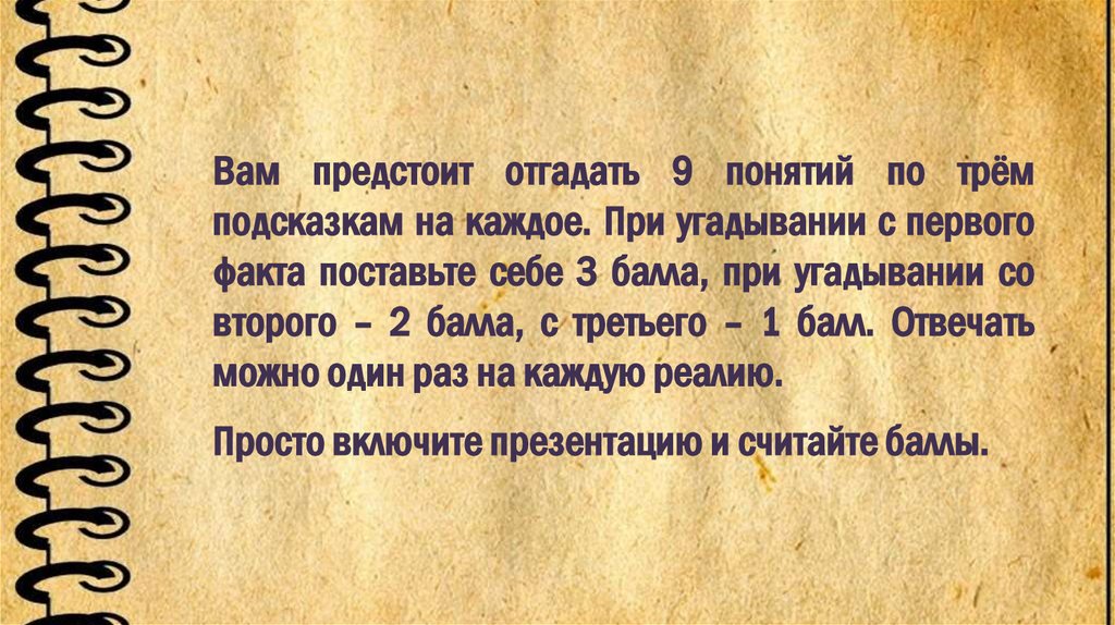 Вам предстоит отгадать 9 понятий по трёмподсказкам на каждое. При угадывании с первого