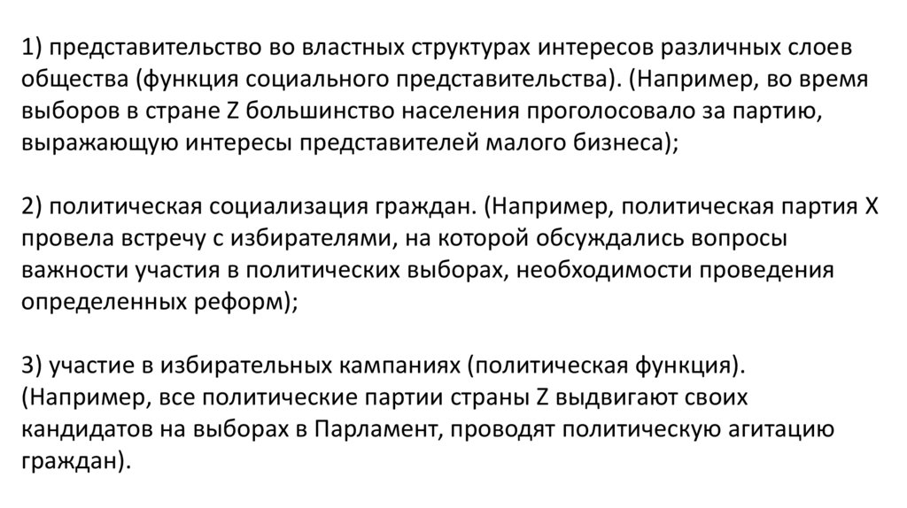 2) политическая социализация граждан. (Например, политическая партия Х