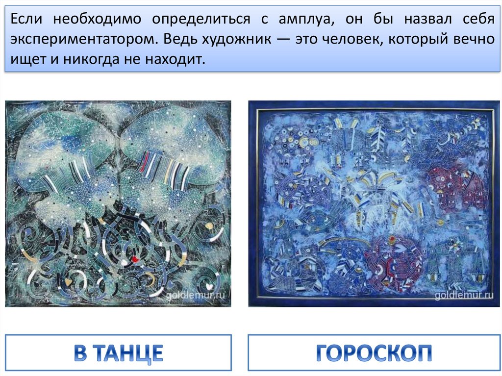 Если необходимо определиться с амплуа, он бы назвал себяэкспериментатором. Ведь художник — это человек, который вечно