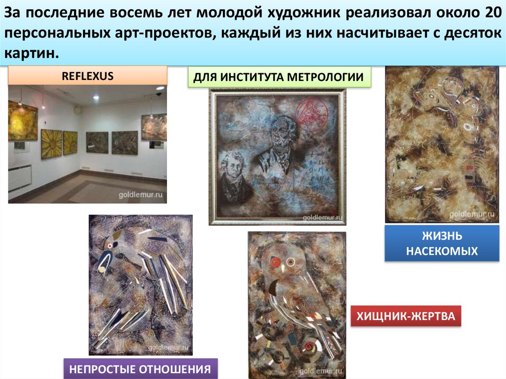 За последние восемь лет молодой художник реализовал около 20персональных арт-проектов, каждый из них насчитывает с десяток