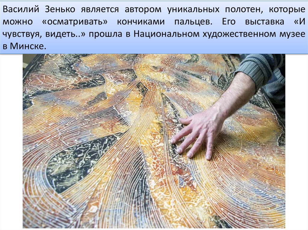 Василий Зенько является автором уникальных полотен, которыеможно «осматривать» кончиками пальцев. Его выставка «И