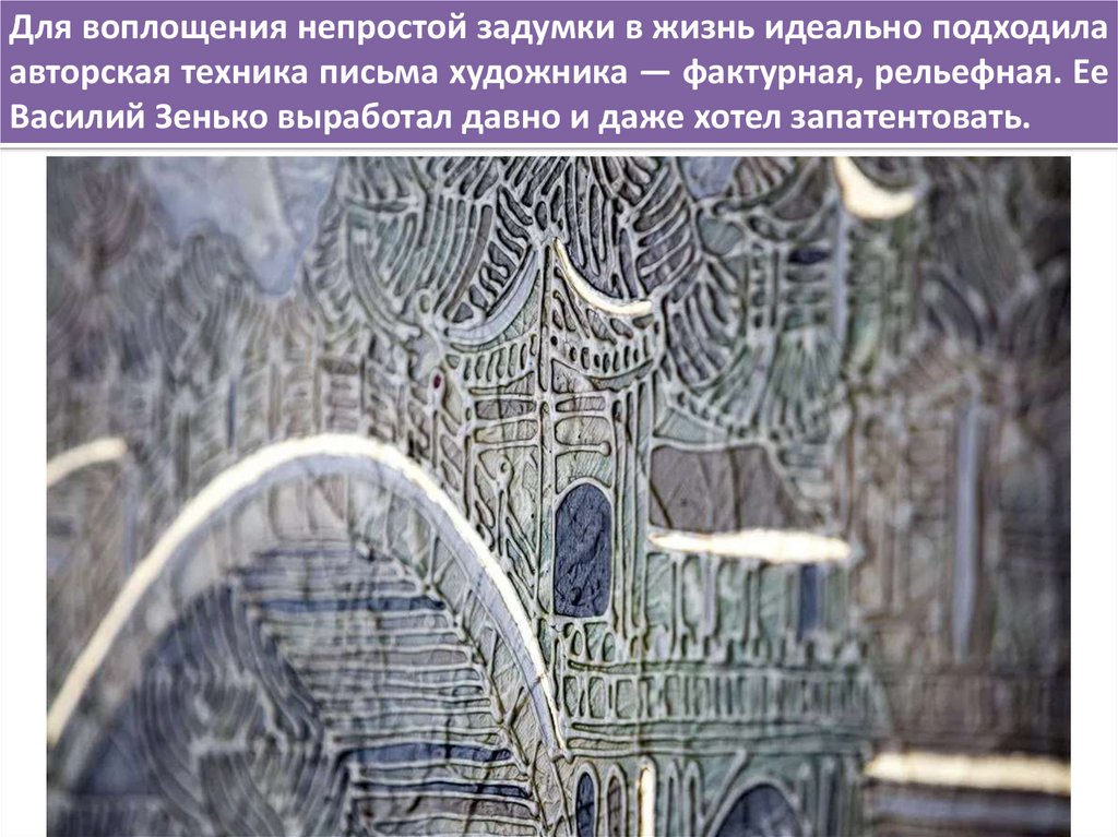Для воплощения непростой задумки в жизнь идеально подходилаавторская техника письма художника — фактурная, рельефная. Ее