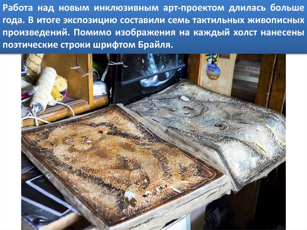 Работа над новым инклюзивным арт-проектом длилась большегода. В итоге экспозицию составили семь тактильных живописных