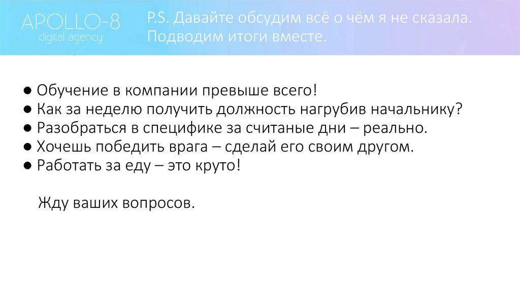 P.S. Давайте обсудим всё о чём я не сказала.Подводим итоги вместе.