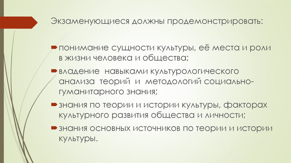 Экзаменующиеся должны продемонстрировать:понимание сущности культуры, её места и роли