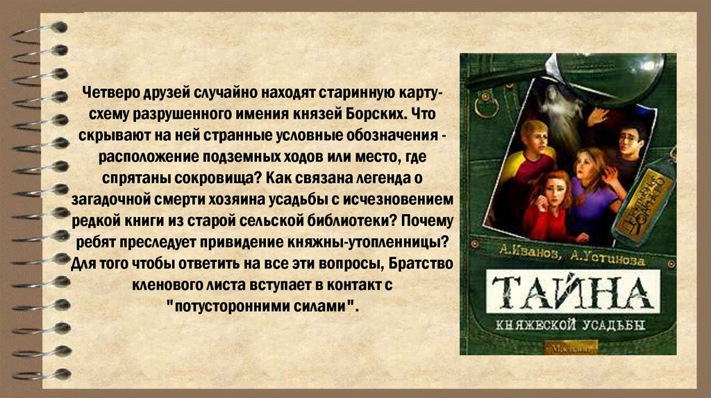 Четверо друзей случайно находят старинную картусхему разрушенного имения князей Борских. Чтоскрывают на ней странные условные обозначения расположение подземных ходов или место, где