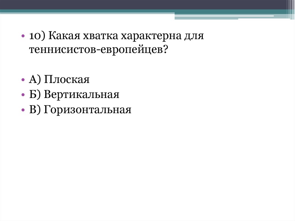 • 10) Какая хватка характерна длятеннисистов-европейцев?