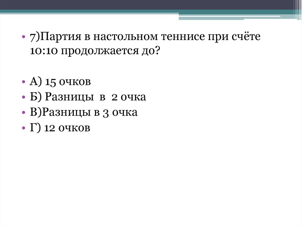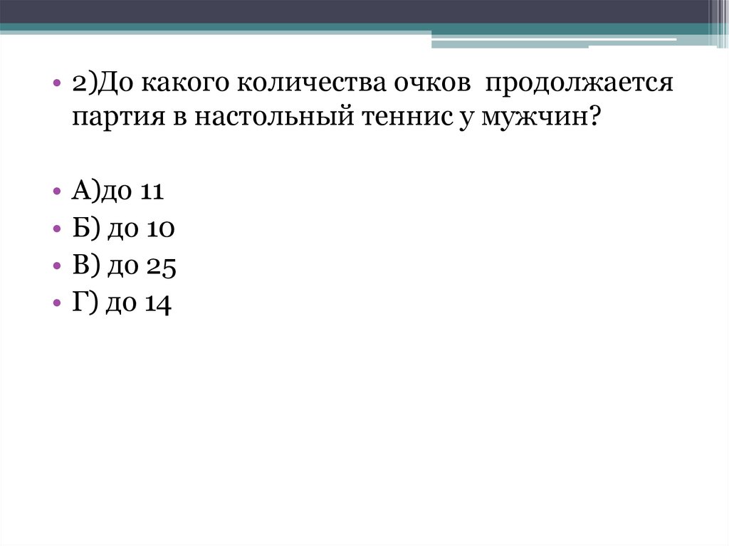 • 2)До какого количества очков продолжаетсяпартия в настольный теннис у мужчин?