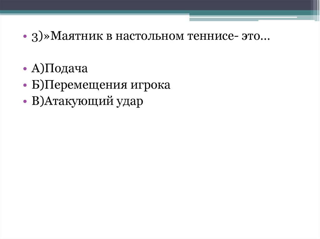 • 3)»Маятник в настольном теннисе- это…• А)Подача