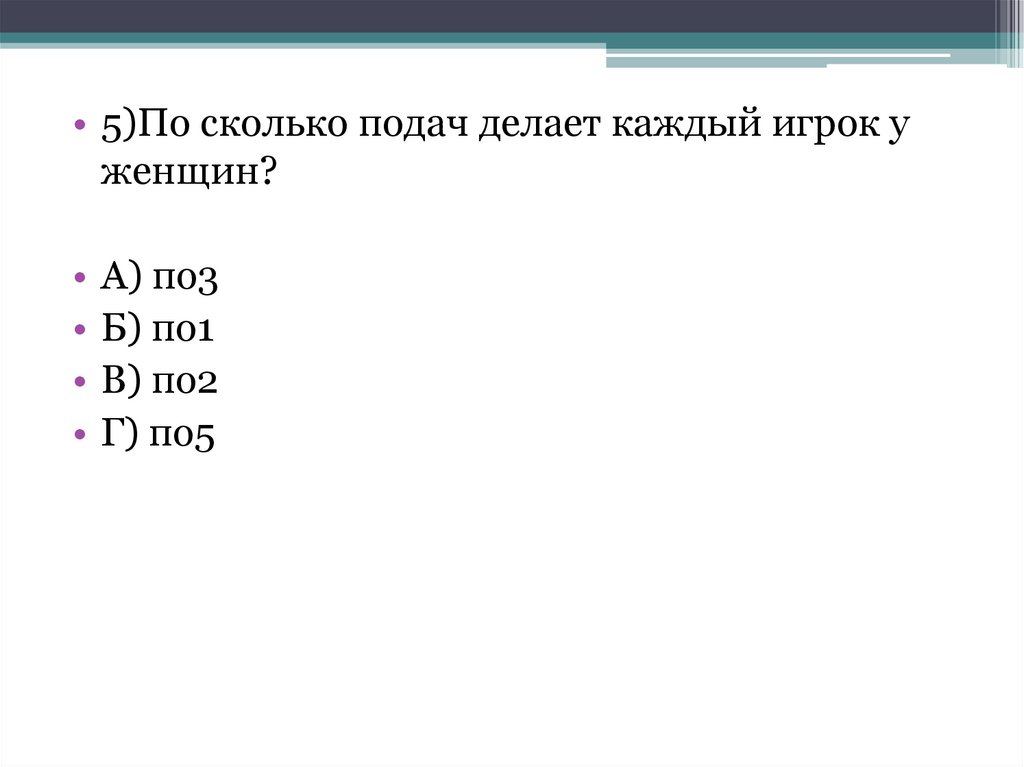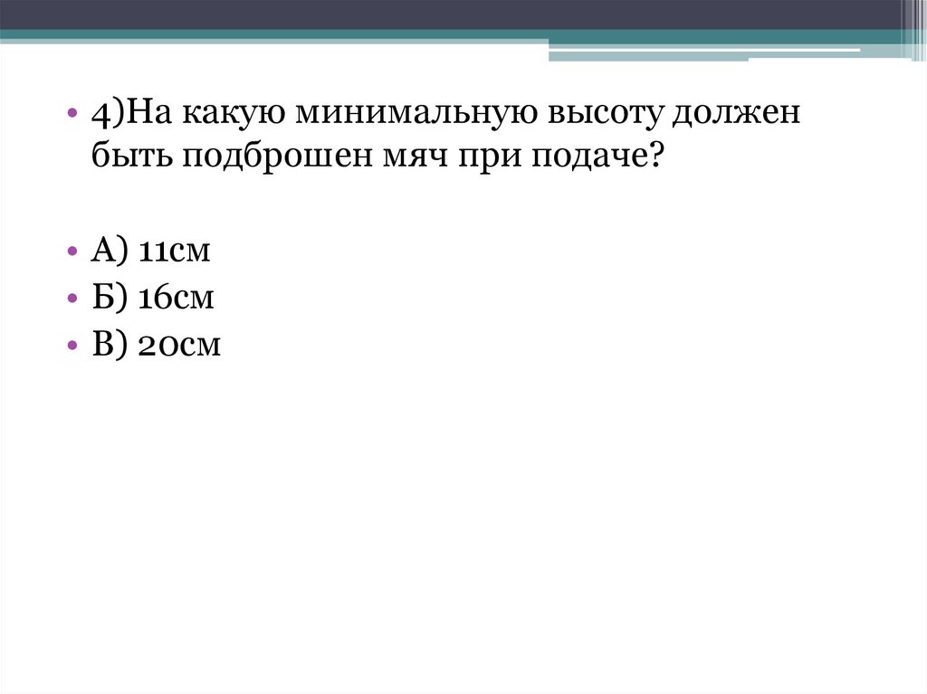• 4)На какую минимальную высоту долженбыть подброшен мяч при подаче?