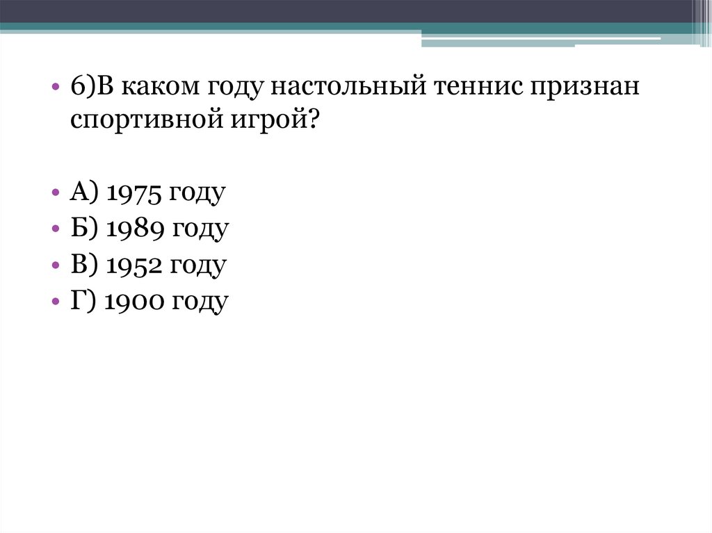 • 6)В каком году настольный теннис признанспортивной игрой?
