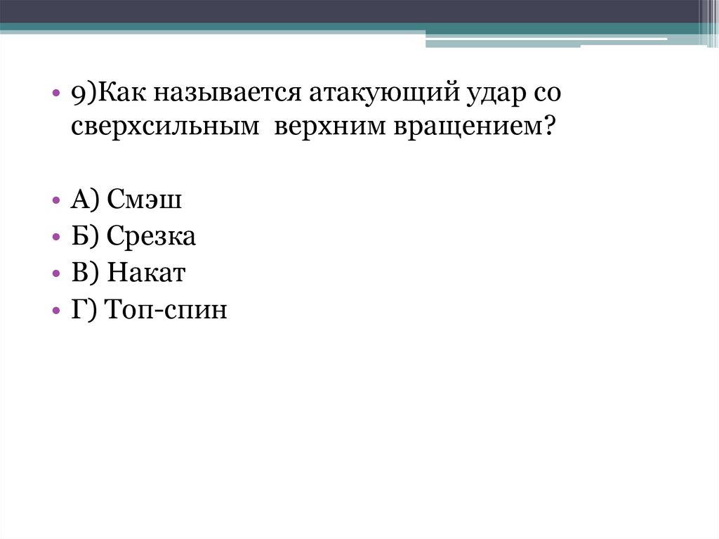 • 9)Как называется атакующий удар сосверхсильным верхним вращением?