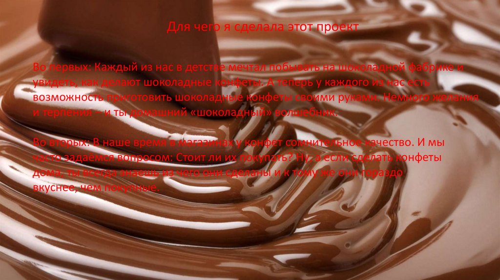 Для чего я сделала этот проектВо первых: Каждый из нас в детстве мечтал побывать на шоколадной фабрике и