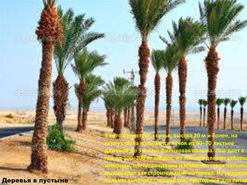 Деревья в пустынеУ него отсутствуют сучья, высота 20 м и более, на