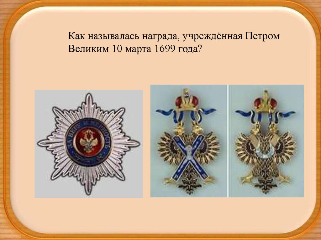 Как называлась награда, учреждённая ПетромВеликим 10 марта 1699 года?