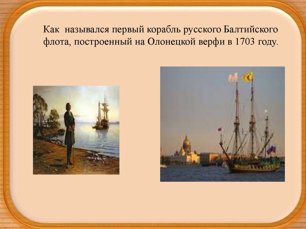 Как назывался первый корабль русского Балтийскогофлота, построенный на Олонецкой верфи в 1703 году.