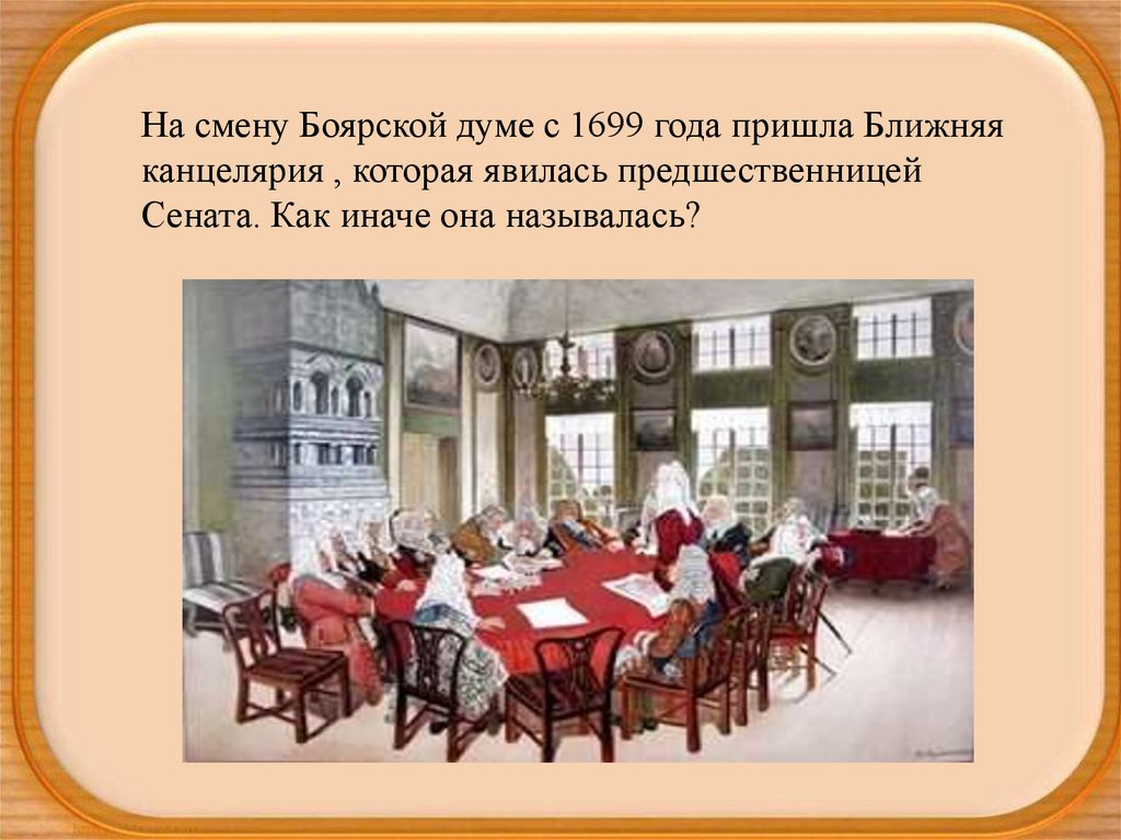 На смену Боярской думе с 1699 года пришла Ближняяканцелярия , которая явилась предшественницей