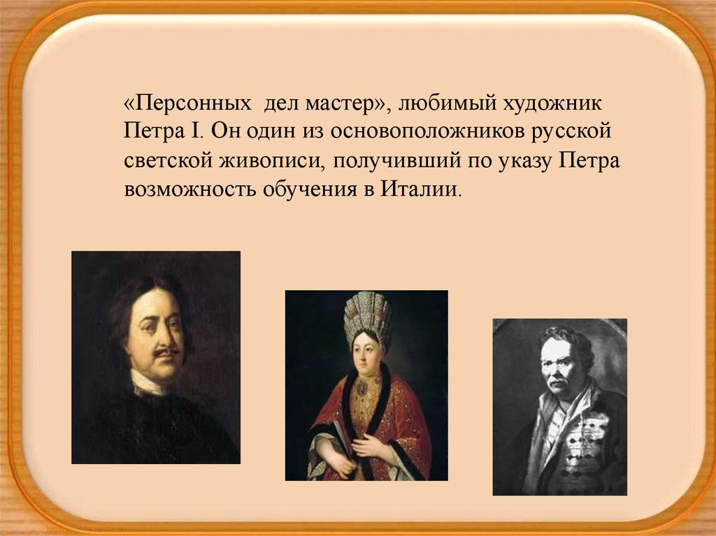 «Персонных дел мастер», любимый художникПетра I. Он один из основоположников русской
